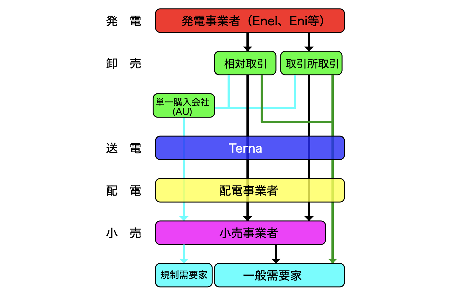 | 配電・供給 | エネルが配電シェアの85%。供給事業者を変更しない家庭用需要家には規制料金が適用。エネルギーサービス管理会社GSEの100%子会社「単一購入者(AU)」が相対取引や電力取引所を通じて電力を購入し、配電事業者に卸売り。 |