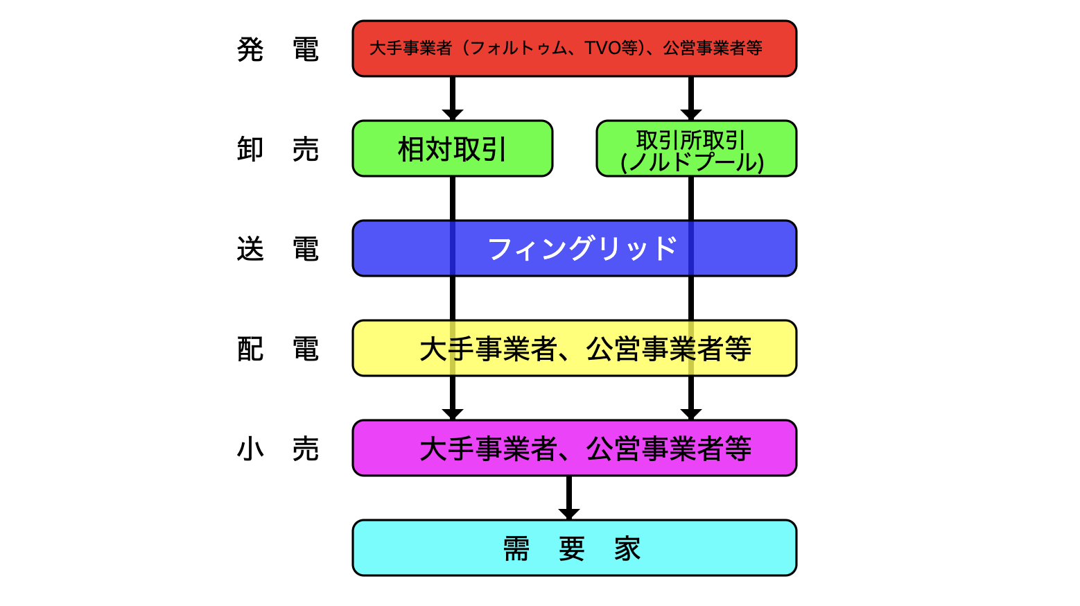 - 卸売市場:1996年に電力取引所EL-EXの運用開始。EL-EXは1998年に北欧国際電力取引所ノルドプールと統合され、北欧地域大での卸電力取引市場を形成。