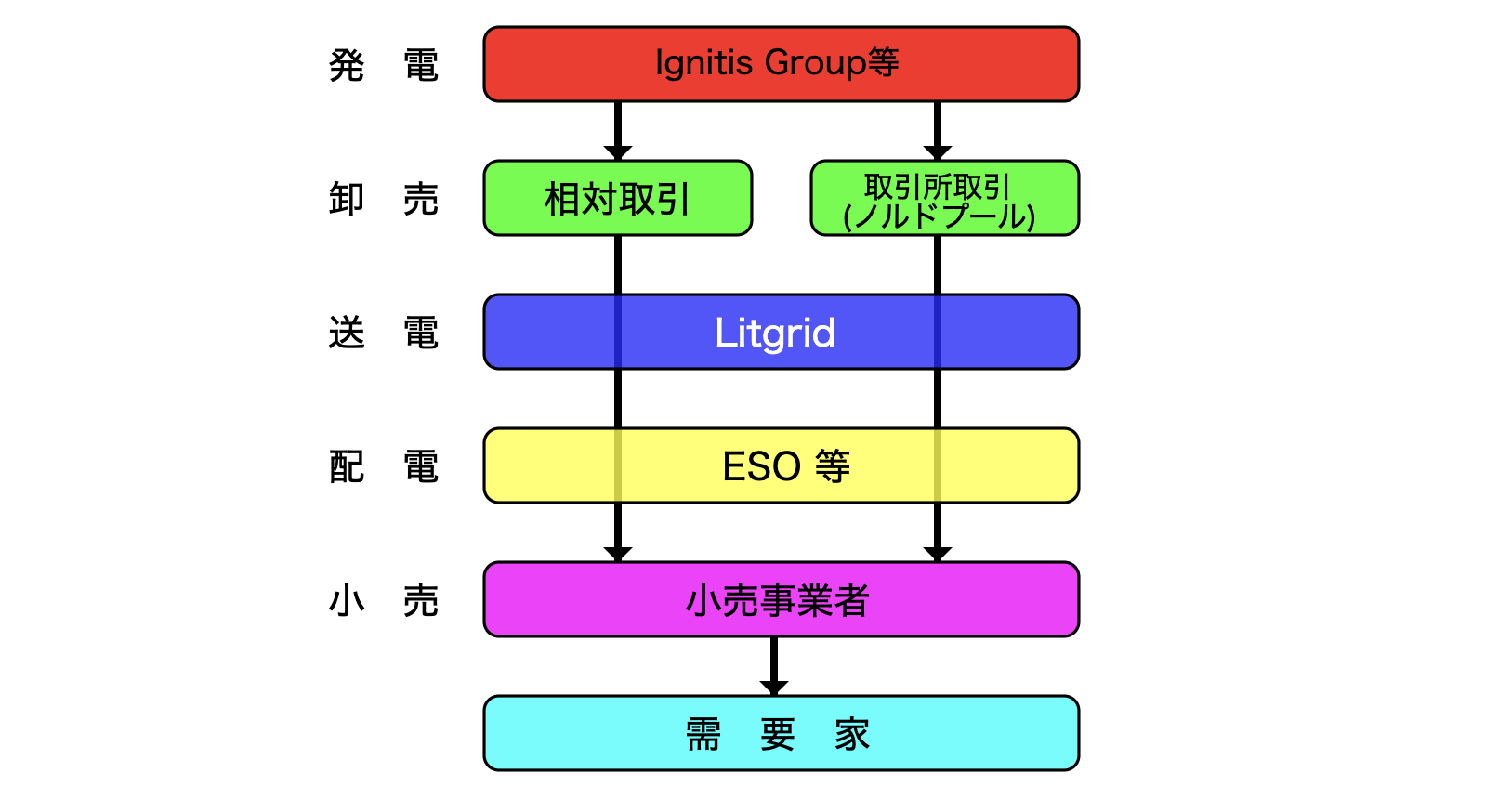 | 配電・ 小売 | イグニティス・グループ傘下のESO社がリトアニアほぼ全域をカバーする配電事業者。その他小規模配電事業者が4社。最終需要家(産業用を含む)へ電力を供給する供給事業者は約60社。 |