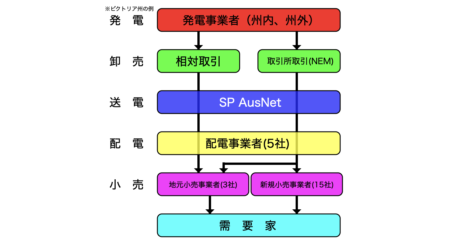 | 規制 | 従来、連邦が州際事項、各州が州内事項を管轄。2005年に連邦大で規制するため、NEM参加地域を対象として、連邦規制機関として豪州エネルギー規制局(AER)および豪州エネルギー市場委員会(AEMC)を設立。前者は送配電、料金規制を除く小売事業、卸売市場の規制、後者は市場制度の検証、変更を担当。 |